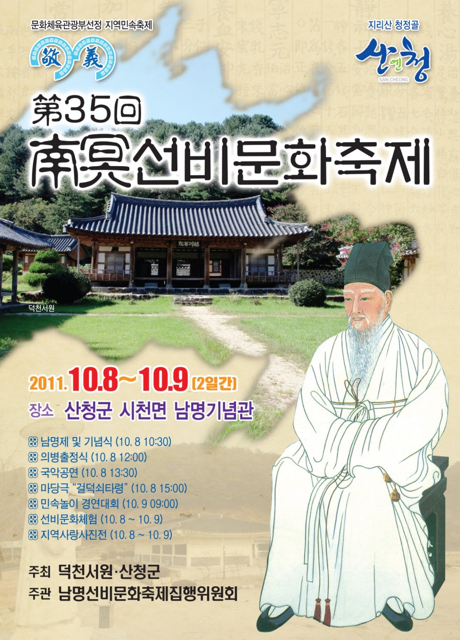 제 35회 남명선비문화축제가 다가오는 10월 8일과 9일 양일간 산청군 시천면 남명기념관 일원에서 개최된다. 이번 축제는 남명제례와 의병출정식 등 남명선생을 숭모하는 행사를 비롯한 전국한시백일장, 학생 풍물경연대회, 학생백일장, 선비체험 행사 등 다채로운 문화행사가 펼쳐진다.